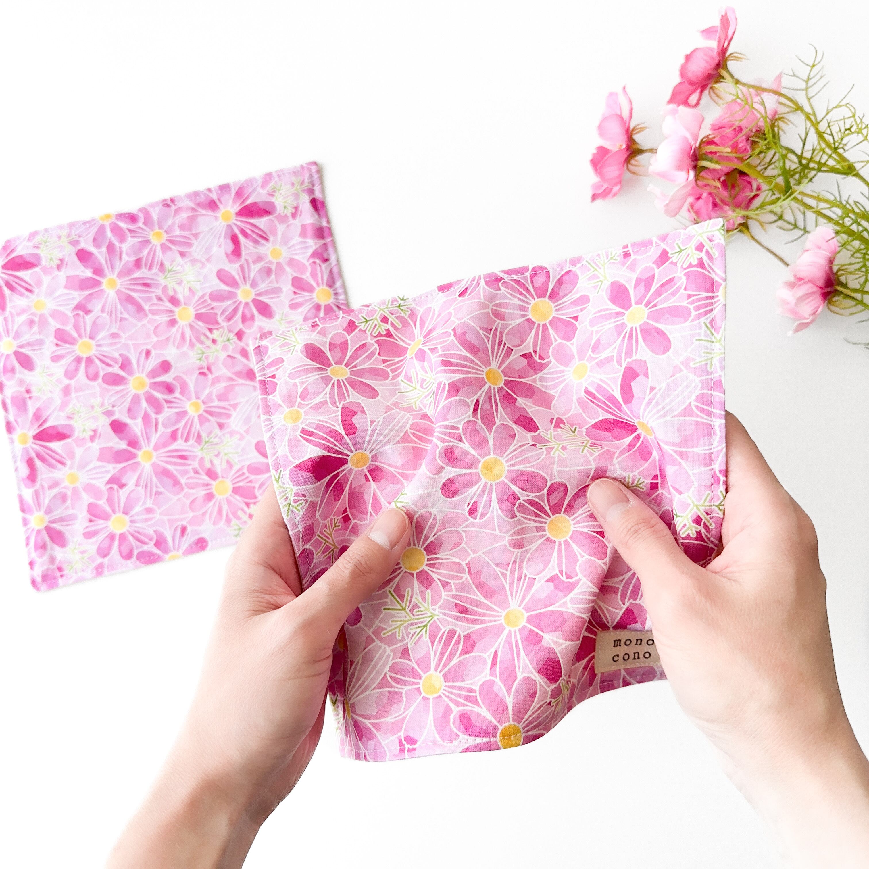 『 コスモス 』名入れ・ループ可 |コットン生地 or ガーゼ+オーガニックコットン |ガーゼハンカチ|出産祝い|誕生日|プチギフト|入園入学|母の日|敬老の日
