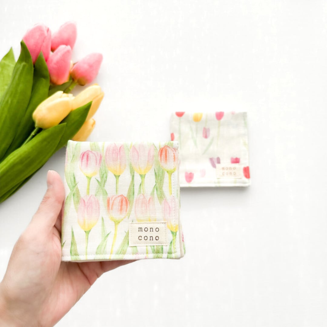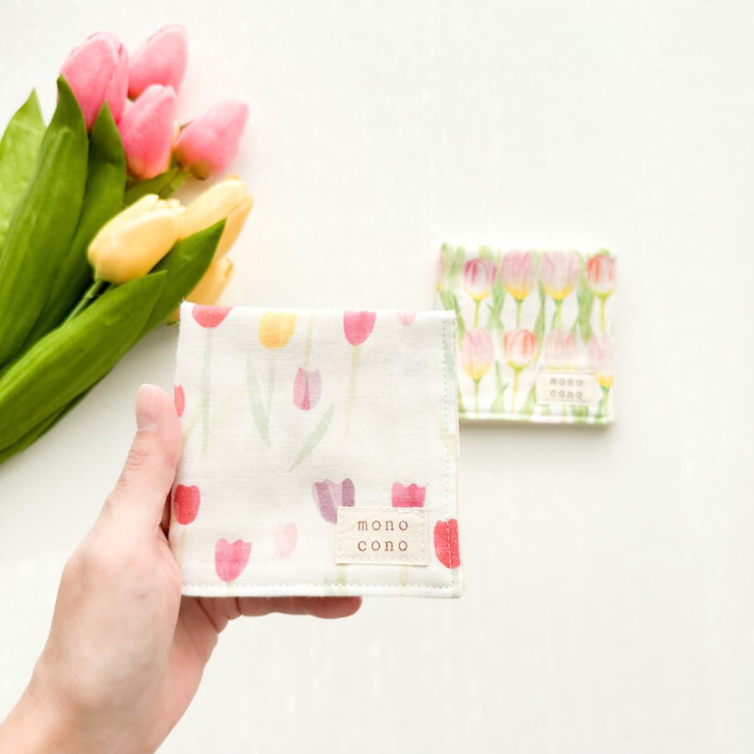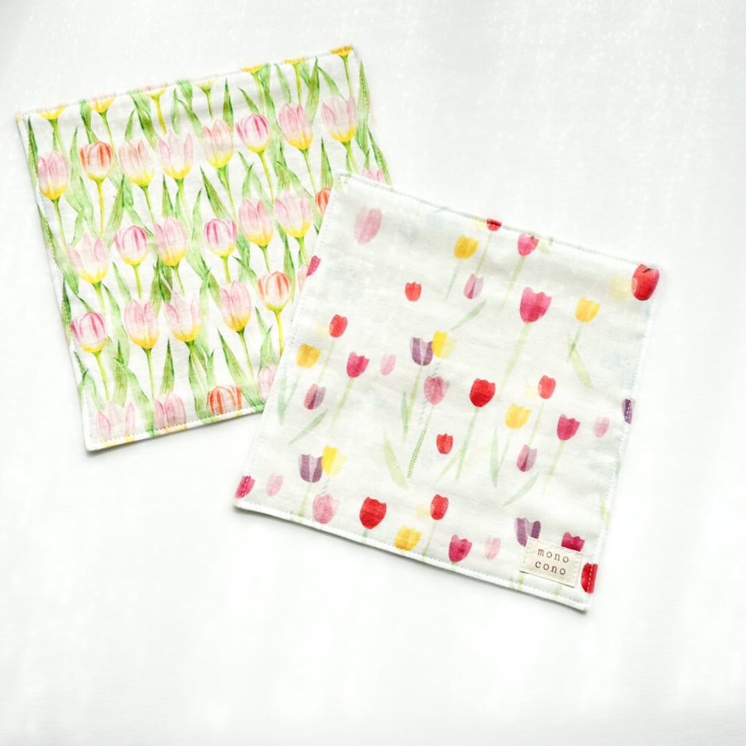 『 チューリップ 』名入れ・ループ可 国産ガーゼ+オーガニックコットン 6重ガーゼハンカチ